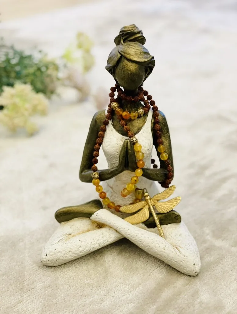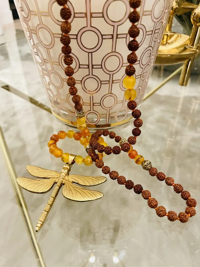 Trollsländan tog mitt hjärta med storm, en otrolig dragning kändes med en gång och får mig att lysa ännu mer. Hon sitter på gula och oranga Agata stenar, några är guldplaterade. Till följd av Rodrachka som är vår jordande sten. Malans boskap står för frihet, att våga flyga. Den ger lycka, självförtroende och mod. Skapar en inre dans och glädje.