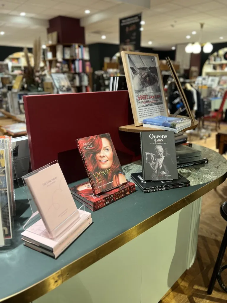 Med lite bubblande ramlösa i champagneglaset tar jag mig glatt vidare mot våning 4. Bokavdelningen. Denna vackra eleganta hörna som osade av kultur, intelligens, kunskap, sagor, romaner, berättelser och sanningsfyllda böcker. Där är jag, och där och där och där. Vackra Mig lyser upp hyllorna med sin röda uppiggande charm. Det är svårt att ta in att just jag fick en plats bland dessa storslagna hyllor. Ovanför mig tittar Niklas Strömstedt fram med sin bok. Men jag lyser, jag lyser av kärlek och glädje till de som går förbi.